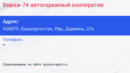 Вираж 74, автогаражный кооператив по адресу 450075, Башкортостан, Уфа, Дарвина, 27а в дальнейшем Организация, размещена в следующих категориях: