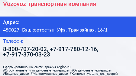 Vozovoz, транспортная компания по адресу 450027, Башкортостан, Уфа, Трамвайная, 16/1 в дальнейшем Организация, размещена в следующих категориях:
