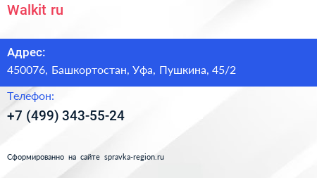 Walkit.ru по адресу 450076, Башкортостан, Уфа, Пушкина, 45/2 в дальнейшем Организация, размещена в следующих категориях: