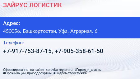 ЗАЙРУС ЛОГИСТИК по адресу 450056, Башкортостан, Уфа, Аграрная, 6 в дальнейшем Организация, размещена в следующих категориях: