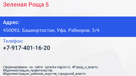 Зеленая Роща-5 по адресу 450092, Башкортостан, Уфа, Рабкоров, 5/4 в дальнейшем Организация, размещена в следующих категориях: