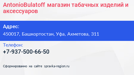 AntonioBulatoff, магазин табачных изделий и аксессуаров по адресу 450017, Башкортостан, Уфа, Ахметова, 311 в дальнейшем Организация, размещена в следующих категориях: