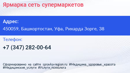 Ярмарка, сеть супермаркетов по адресу 450059, Башкортостан, Уфа, Рихарда Зорге, 38 в дальнейшем Организация, размещена в следующих категориях: