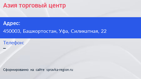 Азия, торговый центр по адресу 450003, Башкортостан, Уфа, Силикатная, 22 в дальнейшем Организация, размещена в следующих категориях: