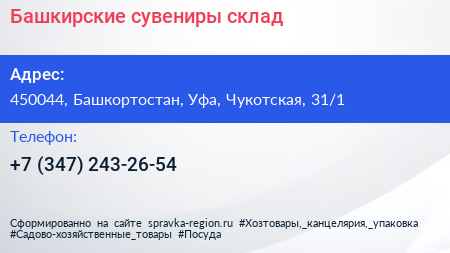 Башкирские сувениры, склад по адресу 450044, Башкортостан, Уфа, Чукотская, 31/1 в дальнейшем Организация, размещена в следующих категориях: