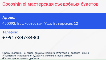 Cocoshin.el, мастерская съедобных букетов по адресу 450092, Башкортостан, Уфа, Батырская, 12 в дальнейшем Организация, размещена в следующих категориях: