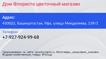 Дом Флориста, цветочный магазин по адресу 450022, Башкортостан, Уфа, улица Менделеева, 139/1 в дальнейшем Организация, размещена в следующих категориях: