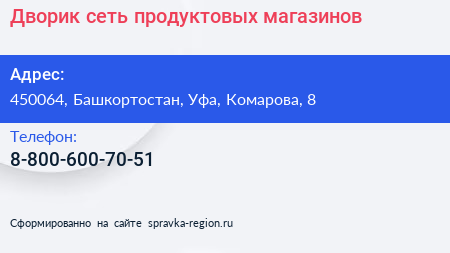 Дворик, сеть продуктовых магазинов по адресу 450064, Башкортостан, Уфа, Комарова, 8 в дальнейшем Организация, размещена в следующих категориях:
