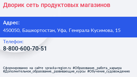 Дворик, сеть продуктовых магазинов по адресу 450050, Башкортостан, Уфа, Генерала Кусимова, 15 в дальнейшем Организация, размещена в следующих категориях: