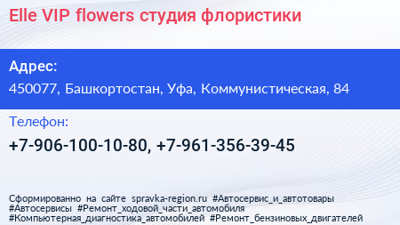 Elle VIP flowers, студия флористики по адресу 450077, Башкортостан, Уфа, Коммунистическая, 84 в дальнейшем Организация, размещена в следующих категориях: