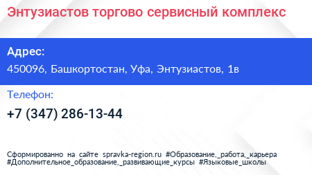 Энтузиастов, торгово-сервисный комплекс по адресу 450096, Башкортостан, Уфа, Энтузиастов, 1в в дальнейшем Организация, размещена в следующих категориях: