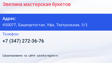 Эвелина, мастерская букетов по адресу 450077, Башкортостан, Уфа, Театральная, 5/1 в дальнейшем Организация, размещена в следующих категориях: