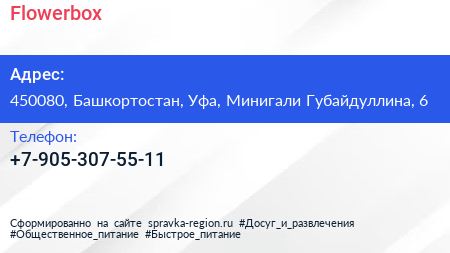 Flowerbox по адресу 450080, Башкортостан, Уфа, Минигали Губайдуллина, 6 в дальнейшем Организация, размещена в следующих категориях: