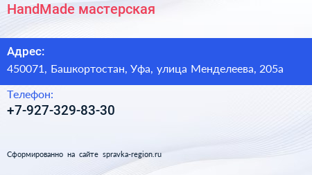 HandMade, мастерская по адресу 450071, Башкортостан, Уфа, улица Менделеева, 205а в дальнейшем Организация, размещена в следующих категориях: