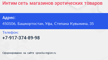 Интим, сеть магазинов эротических товаров по адресу 450106, Башкортостан, Уфа, Степана Кувыкина, 35 в дальнейшем Организация, размещена в следующих категориях: