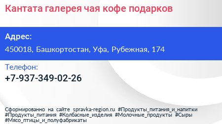 Кантата, галерея чая, кофе, подарков по адресу 450018, Башкортостан, Уфа, Рубежная, 174 в дальнейшем Организация, размещена в следующих категориях: