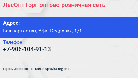 ЛесОптТорг, оптово-розничная сеть по адресу Башкортостан, Уфа, Кедровая, 1/1 в дальнейшем Организация, размещена в следующих категориях: