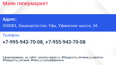 Маяк, гипермаркет по адресу 450081, Башкортостан, Уфа, Уфимское шоссе, 34 в дальнейшем Организация, размещена в следующих категориях: