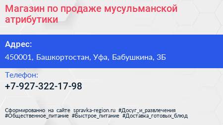 Магазин по продаже мусульманской атрибутики по адресу 450001, Башкортостан, Уфа, Бабушкина, 3Б в дальнейшем Организация, размещена в следующих категориях:
