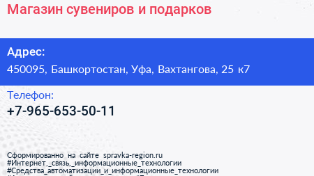 Магазин сувениров и подарков по адресу 450095, Башкортостан, Уфа, Вахтангова, 25 к7 в дальнейшем Организация, размещена в следующих категориях: