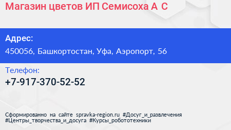 Магазин цветов, ИП Семисоха А.С. по адресу 450056, Башкортостан, Уфа, Аэропорт, 56 в дальнейшем Организация, размещена в следующих категориях: