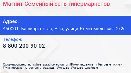Магнит Семейный, сеть гипермаркетов по адресу 450001, Башкортостан, Уфа, улица Комсомольская, 2/2г в дальнейшем Организация, размещена в следующих категориях: