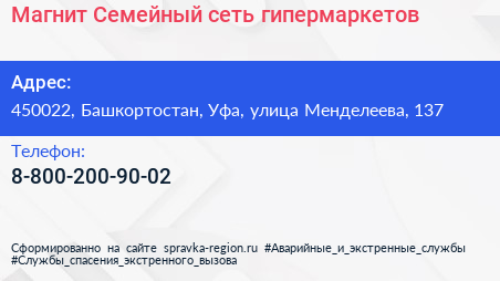 Магнит Семейный, сеть гипермаркетов по адресу 450022, Башкортостан, Уфа, улица Менделеева, 137 в дальнейшем Организация, размещена в следующих категориях: