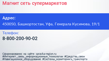 Магнит, сеть супермаркетов по адресу 450050, Башкортостан, Уфа, Генерала Кусимова, 19/1 в дальнейшем Организация, размещена в следующих категориях: