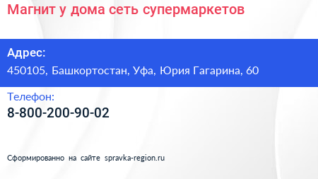 Магнит у дома, сеть супермаркетов по адресу 450105, Башкортостан, Уфа, Юрия Гагарина, 60 в дальнейшем Организация, размещена в следующих категориях: