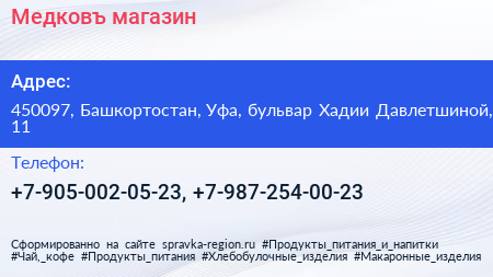 Медковъ, магазин по адресу 450097, Башкортостан, Уфа, бульвар Хадии Давлетшиной, 11 в дальнейшем Организация, размещена в следующих категориях: