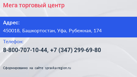 Мега, торговый центр по адресу 450018, Башкортостан, Уфа, Рубежная, 174 в дальнейшем Организация, размещена в следующих категориях: