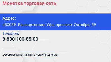 Монетка, торговая сеть по адресу 450059, Башкортостан, Уфа, проспект Октября, 59 в дальнейшем Организация, размещена в следующих категориях: