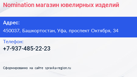 Nomination, магазин ювелирных изделий по адресу 450037, Башкортостан, Уфа, проспект Октября, 34 в дальнейшем Организация, размещена в следующих категориях: