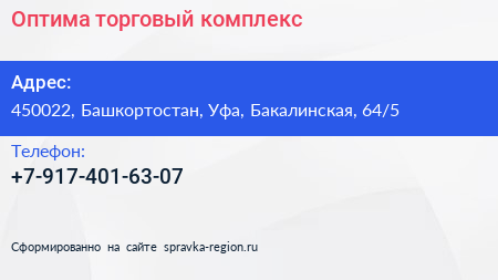 Оптима, торговый комплекс по адресу 450022, Башкортостан, Уфа, Бакалинская, 64/5 в дальнейшем Организация, размещена в следующих категориях: