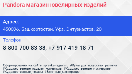 Pandora, магазин ювелирных изделий по адресу 450096, Башкортостан, Уфа, Энтузиастов, 20 в дальнейшем Организация, размещена в следующих категориях: