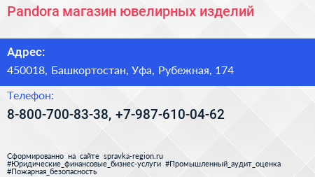 Pandora, магазин ювелирных изделий по адресу 450018, Башкортостан, Уфа, Рубежная, 174 в дальнейшем Организация, размещена в следующих категориях: