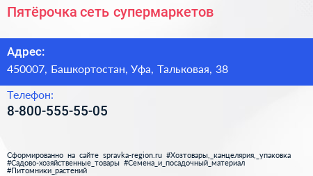 Пятёрочка, сеть супермаркетов по адресу 450007, Башкортостан, Уфа, Тальковая, 38 в дальнейшем Организация, размещена в следующих категориях:
