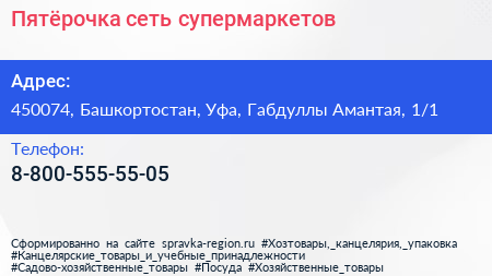 Пятёрочка, сеть супермаркетов по адресу 450074, Башкортостан, Уфа, Габдуллы Амантая, 1/1 в дальнейшем Организация, размещена в следующих категориях: