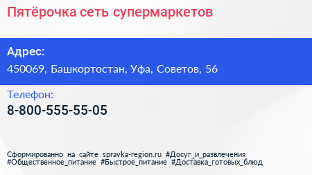 Пятёрочка, сеть супермаркетов по адресу 450069, Башкортостан, Уфа, Советов, 56 в дальнейшем Организация, размещена в следующих категориях: