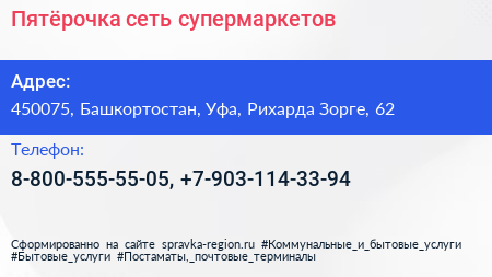 Пятёрочка, сеть супермаркетов по адресу 450075, Башкортостан, Уфа, Рихарда Зорге, 62 в дальнейшем Организация, размещена в следующих категориях: