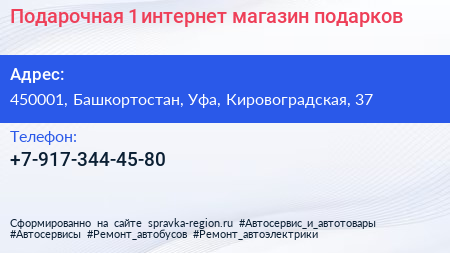 Подарочная №1, интернет-магазин подарков по адресу 450001, Башкортостан, Уфа, Кировоградская, 37 в дальнейшем Организация, размещена в следующих категориях: