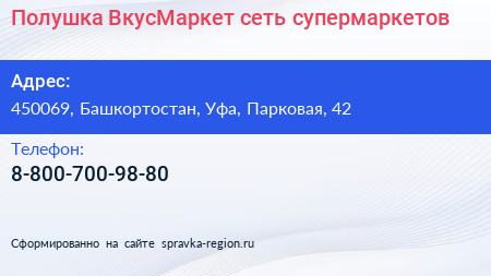 Полушка ВкусМаркет, сеть супермаркетов по адресу 450069, Башкортостан, Уфа, Парковая, 42 в дальнейшем Организация, размещена в следующих категориях: