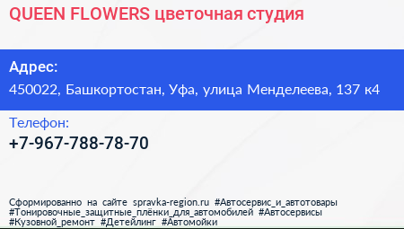 QUEEN FLOWERS, цветочная студия по адресу 450022, Башкортостан, Уфа, улица Менделеева, 137 к4 в дальнейшем Организация, размещена в следующих категориях: