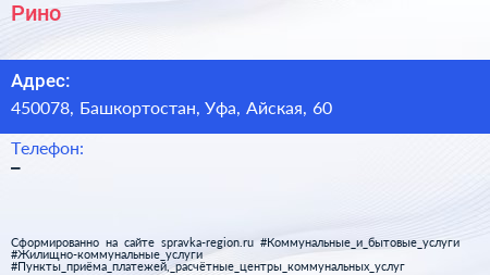 Рино по адресу 450078, Башкортостан, Уфа, Айская, 60 в дальнейшем Организация, размещена в следующих категориях: