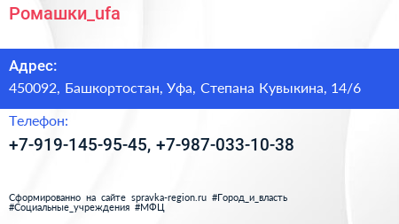 Ромашки_ufa по адресу 450092, Башкортостан, Уфа, Степана Кувыкина, 14/6 в дальнейшем Организация, размещена в следующих категориях: