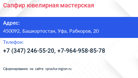 Сапфир, ювелирная мастерская по адресу 450092, Башкортостан, Уфа, Рабкоров, 20 в дальнейшем Организация, размещена в следующих категориях: