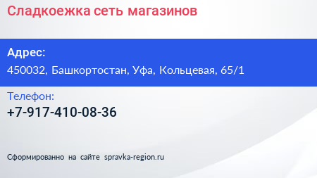 Сладкоежка, сеть магазинов по адресу 450032, Башкортостан, Уфа, Кольцевая, 65/1 в дальнейшем Организация, размещена в следующих категориях: