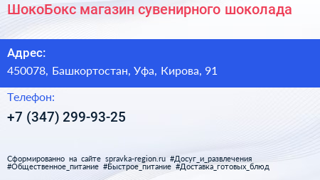 ШокоБокс, магазин сувенирного шоколада по адресу 450078, Башкортостан, Уфа, Кирова, 91 в дальнейшем Организация, размещена в следующих категориях: