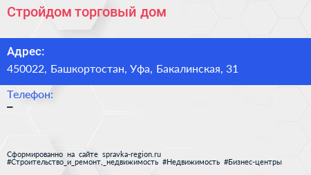 Стройдом, торговый дом по адресу 450022, Башкортостан, Уфа, Бакалинская, 31 в дальнейшем Организация, размещена в следующих категориях: