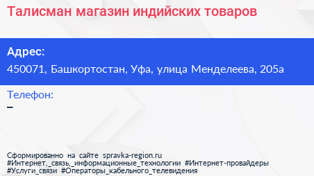 Талисман, магазин индийских товаров по адресу 450071, Башкортостан, Уфа, улица Менделеева, 205а в дальнейшем Организация, размещена в следующих категориях: